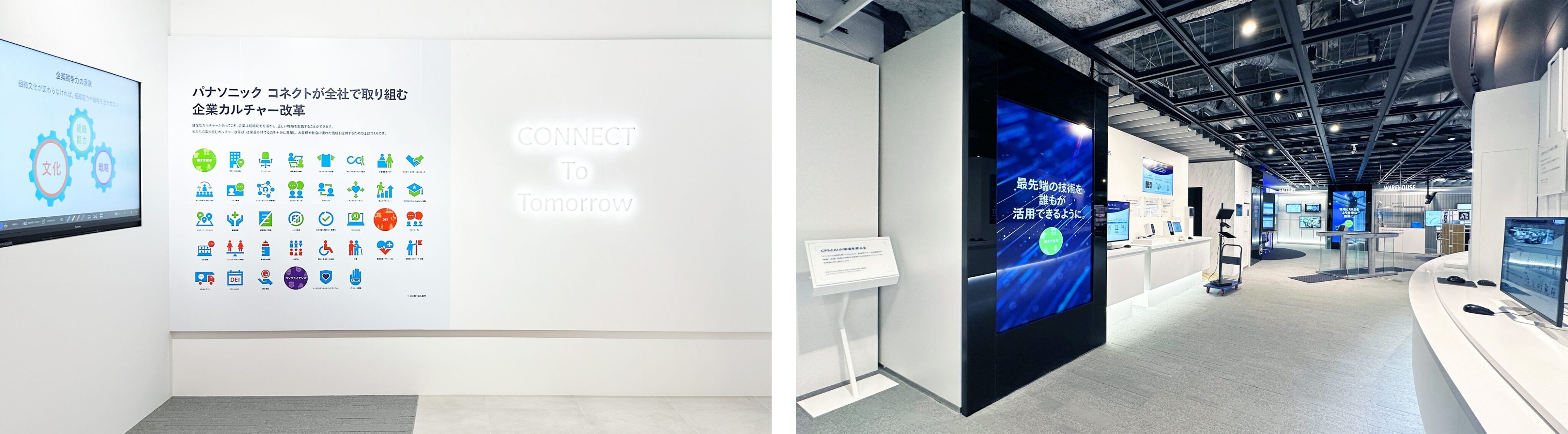「パナソニックコネクトはお客様にとって最高の共創パートナーである」という従来からのテーマを継承しつつ、今回は、カルチャー改革がソリューションの価値や品質向上に貢献していることを伝えるため、「社内の健全な風土があるからこそ競争力が生まれ、お客様にとってより良いものへと進化する」という新たなメッセージを掲げて、各エリアでのコンテンツを制作しました。